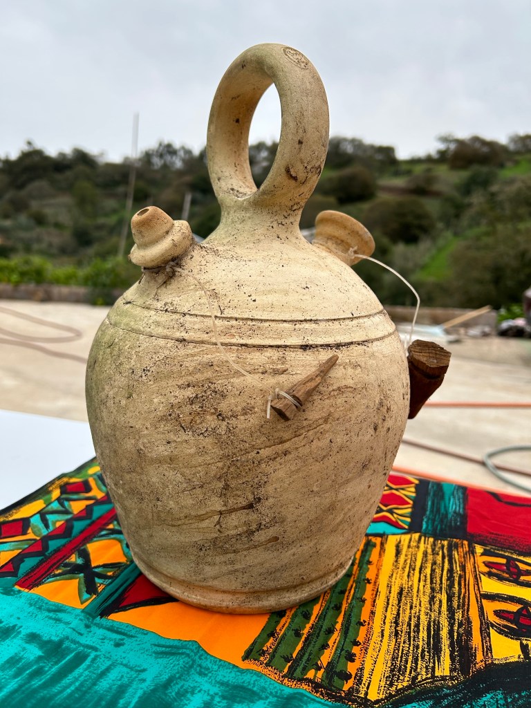 Het was de hele dag licht bewolkt en de zon scheen lichtjes door de vederwolken. Ideaal om buiten te werken. Ik heb een heel stuk tuin van bramenstruiken bevrijd en een prachtige kruik gevonden!