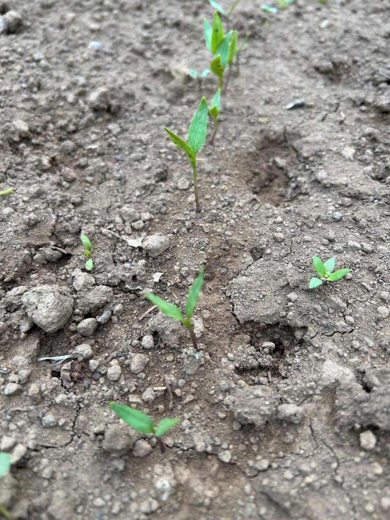 De rode paprika’s zijn mooi gekiemd en staan met twee frisse blaadjes net boven de grond.