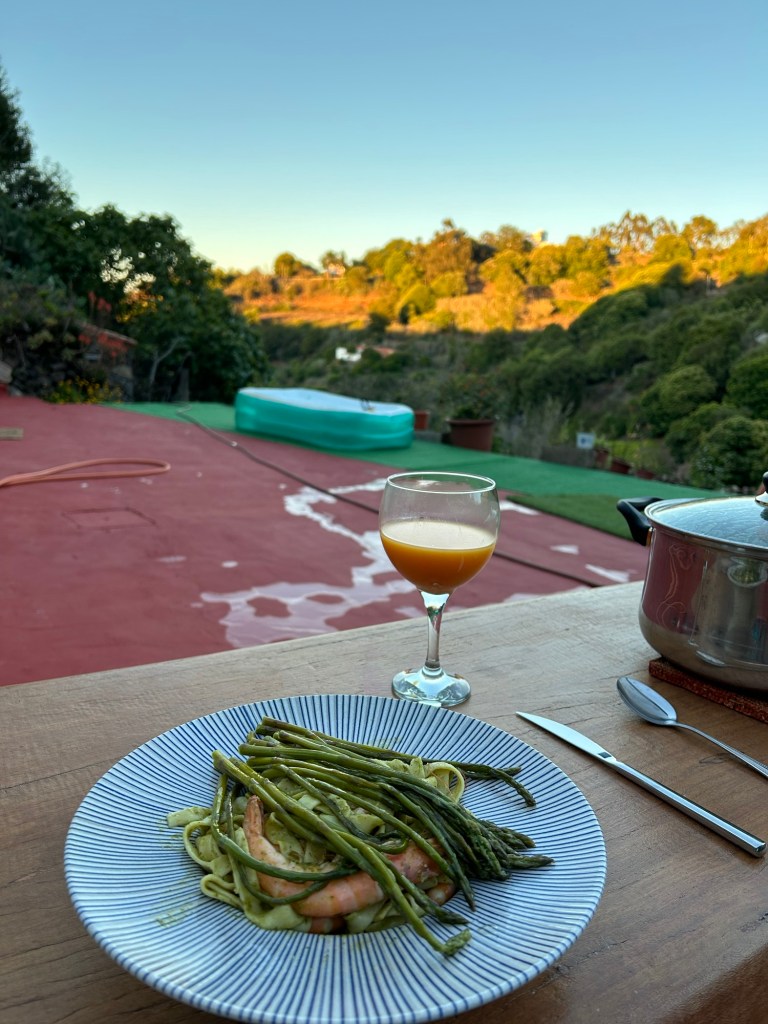 Tagliatelle met pesto van avocado en koriander, met gamba’s en groene asperges en een campari naranja . Met een mooi zicht erbij.. meer moet dat niet zijn ♥️👌🏿😋