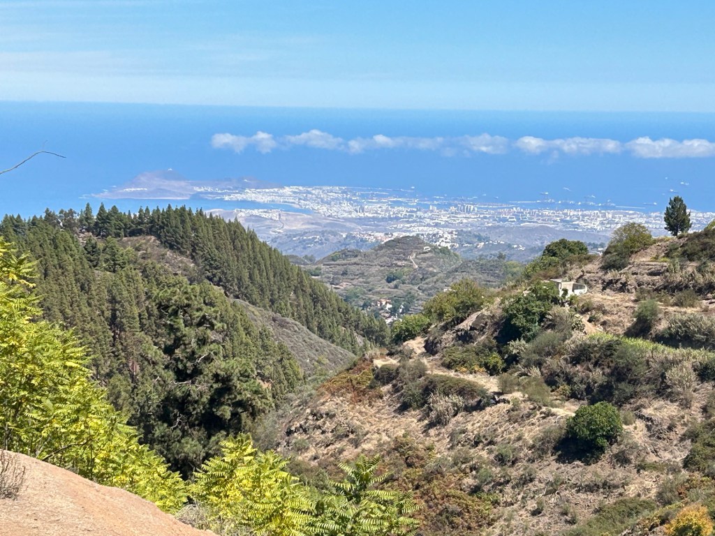 In de verte is de hoofdstad Las Palmas te zien met erboven de bijna constant aanwezige wolk die men hier “ la pensa del burro” noemt. ( De buik van de ezel)
